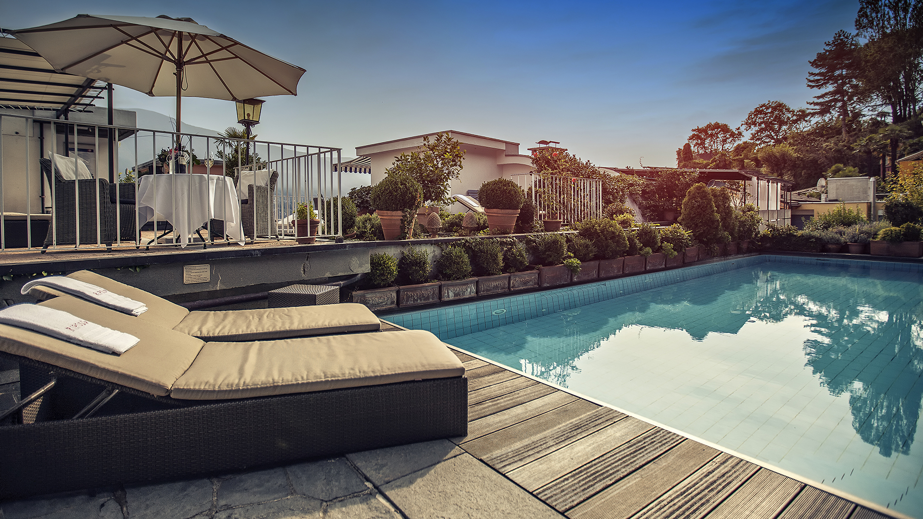 Poiché siamo una piccola azienda a conduzione famigliare giunta alla terza generazione, non facciamo parte di grandi catene , la casa esprime già per questo motivo il suo fascino. Ogni dettaglio viene curato con amore. Dal giardino provengono tutti i nostri fiori che impreziosiscono la casa. Anche nel ristorante diamo un tocco in più alle pietanze di nostra creazione usando le erbe aromatiche che coltiviamo noi stessi. L’ospitalità e la gioia si respirano in ogni angolo. La vista meravigliosa sui tetti di Ascona e sul Lago Maggiore è perfetta per godersi una cena romantica sulla nostra terrazza. Per rimanere freschi ci si tuffa nella piscina appena rinnovata. In ogni caso un particolare molto importante è che la musica jazz da noi è di casa. Ogni sabato infatti Olivia & the Funcats si esibiscono dal vivo nel nostro cortile e danno vita ad un’atmosfera vivace.